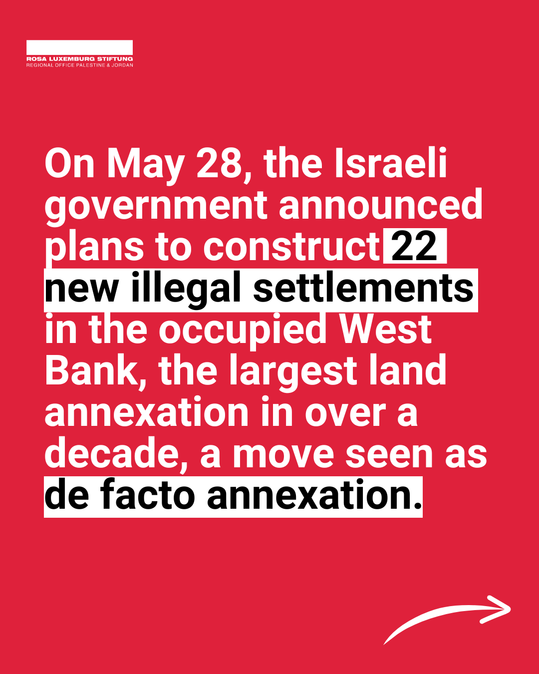 On May 28, 2025, Israel announced 22 new illegal West Bank settlements, its largest land annexation in over a decade according to Israeli NGO Peace Now.