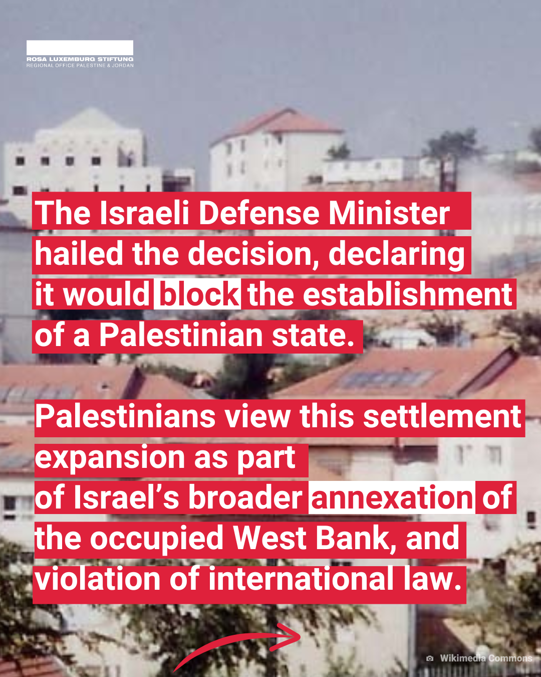 The Israeli Minister of Defense, Israel Katz, celebrated the decision, saying it will prevent the creation of a Palestinian state. For Palestinians, this is a serious escalation and a step further towards the defacto annexation of the West Bank by Israel.