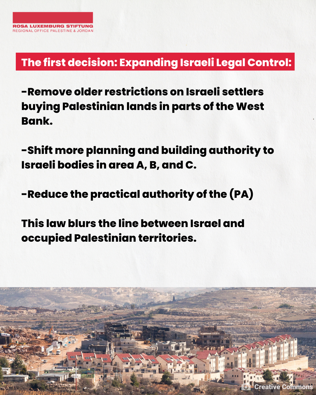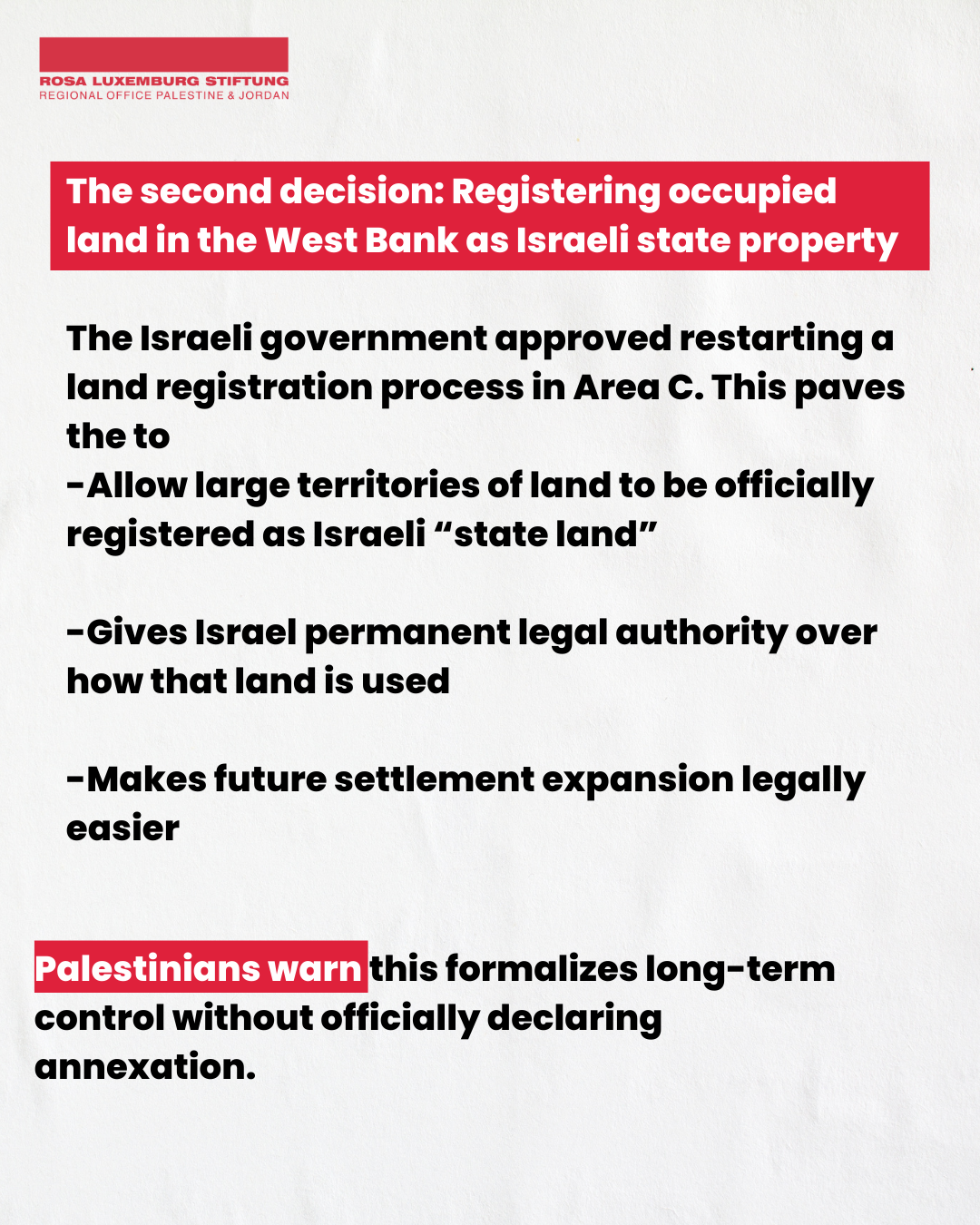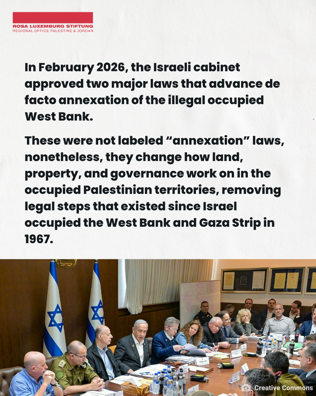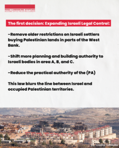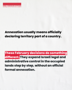The Israeli security cabinet approved two bills in February 2026 that intensify the de facto annexation that is “legalizing” annexation occurring in the illegal occupied West Bank.