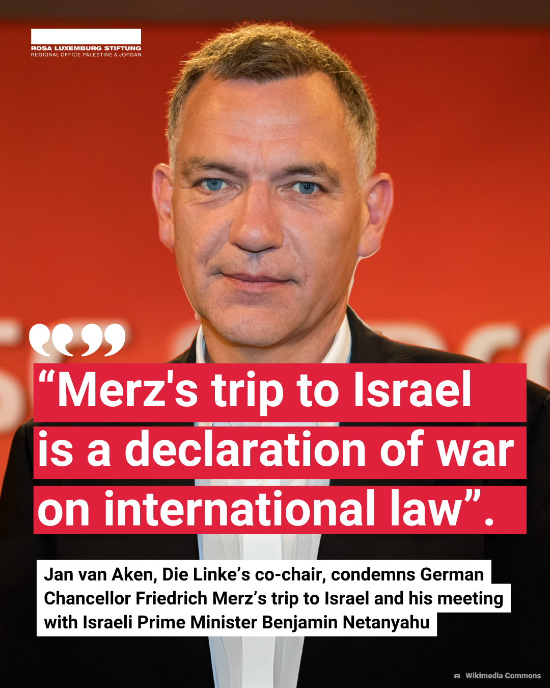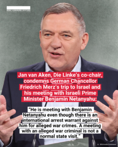 Jan van Aken, Die Linke’s Co-Chair, condemned the visit and the meeting with Netanyahu stating: “Merz’s trip to Israel is a declaration of war on international law. He is meeting with Benjamin Netanyahu even though there is an international arrest warrant against him for alleged war crimes. A meeting with an alleged war criminal is not a normal state visit”